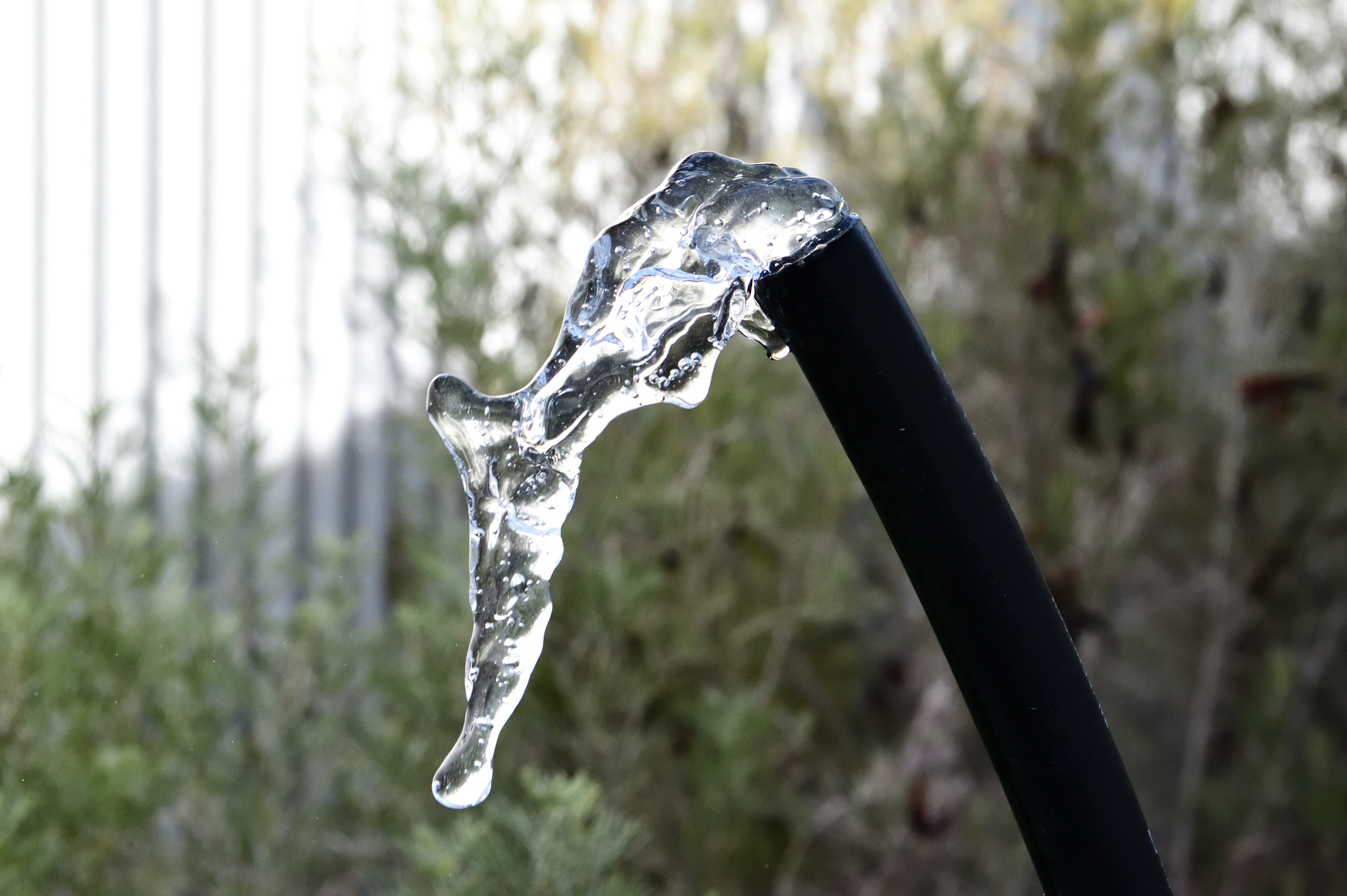 Next, when I do laundry, I am letting the water run out through the greywater system’s overflow line, which is attached to a riser in my feathery senna shrubs. When the washing machine water drains out, it geysers out through this overflow line. (See above photo.)