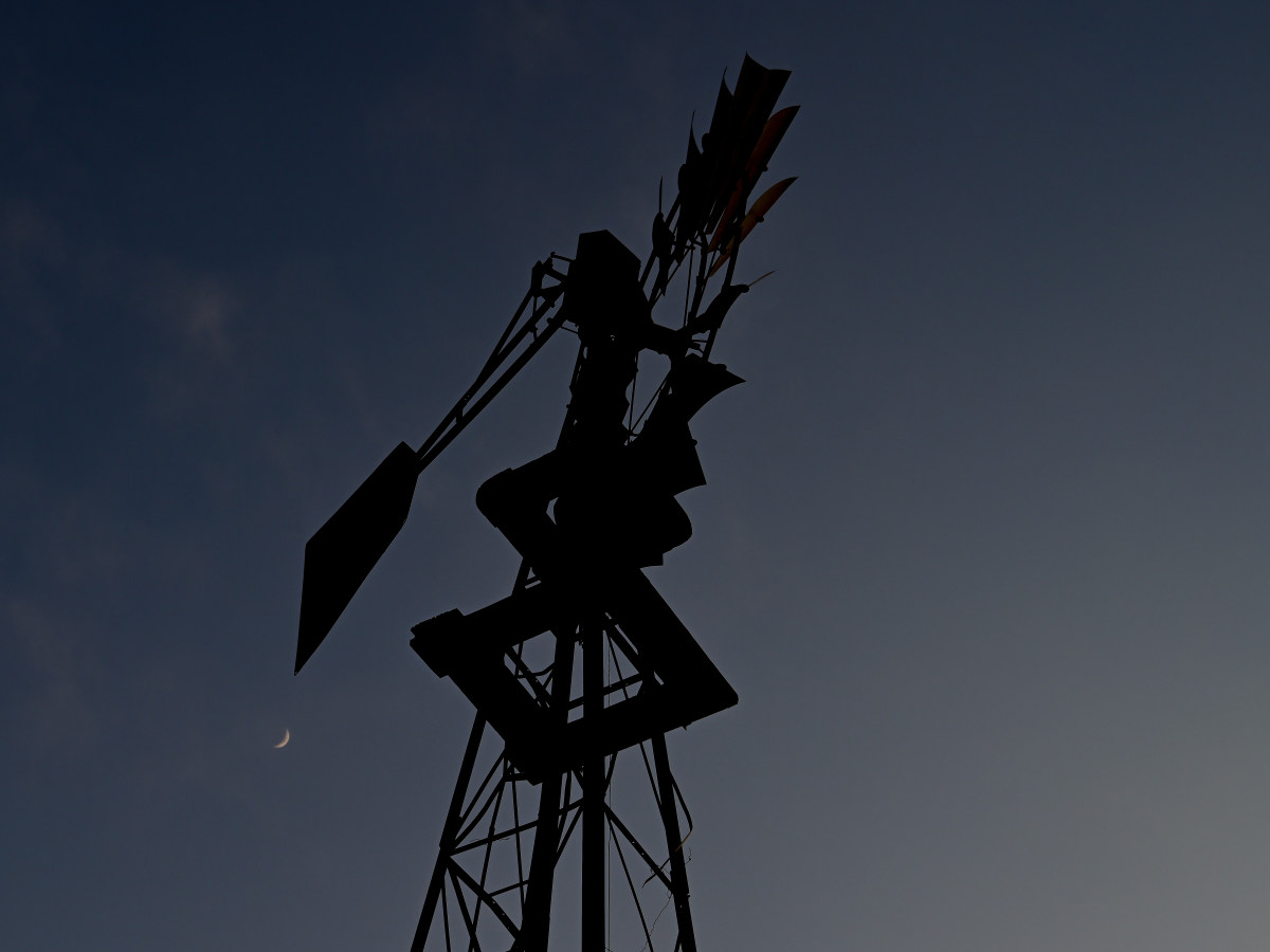 Also in the City of Rocks, ancient stone surrounds a tiny puddle reflecting the late afternoon sky. And, at twilight, the juxtaposition of a windmill with a waxing crescent moon.